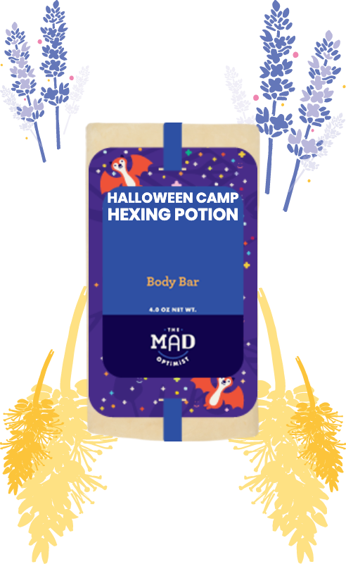 Bar Soap | Base selection: Neutral Skin | Scents selection: Lavender, Lavender, Patchouli, Patchouli | Addins selection: Rolled Oats, Shea Butter, Coconut Milk Powder | Recipe label line 1: HALLOWEEN CAMP | Recipe label line 2: HEXING POTION | Label image: bats-barsoap