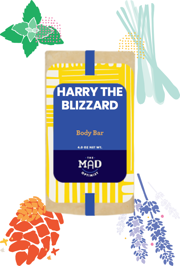 Bar Soap | Base selection: Dry Skin | Scents selection: Cedarwood, Lavender, Lemongrass, Peppermint | Recipe label line 1: HARRY THE | Recipe label line 2: BLIZZARD | Label image: yellow-barsoap